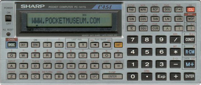 The Sharp PC-1417G CASL is a programmable calculator with 12 digits precision and formula input logic. It has an unknown number of functions, 78 keys and an LCD (liquid crystal) display. The power source is 2xCR2032 3V.