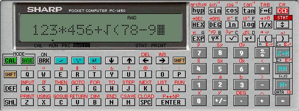 The Sharp PC-1450 is a programmable calculator with 12 digits precision and formula input logic. It has an unknown number of functions, 78 keys and an LCD (liquid crystal) display. The power source is 2xCR2032 3V.