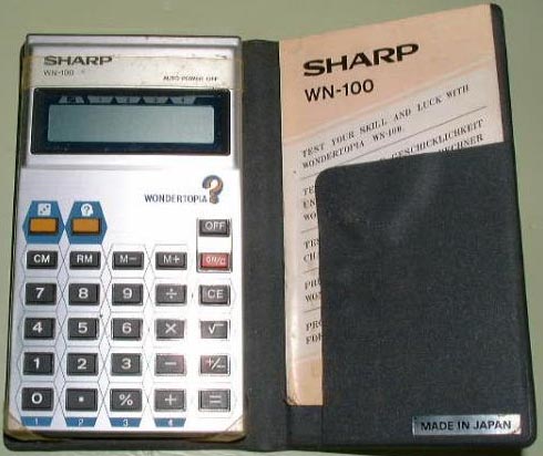 The Sharp WN-100 WONDERTOPIA is an arithmetic calculator with 8 digits precision and algebraic logic. It has 7 functions, 28 keys and an LCD (liquid crystal) display.