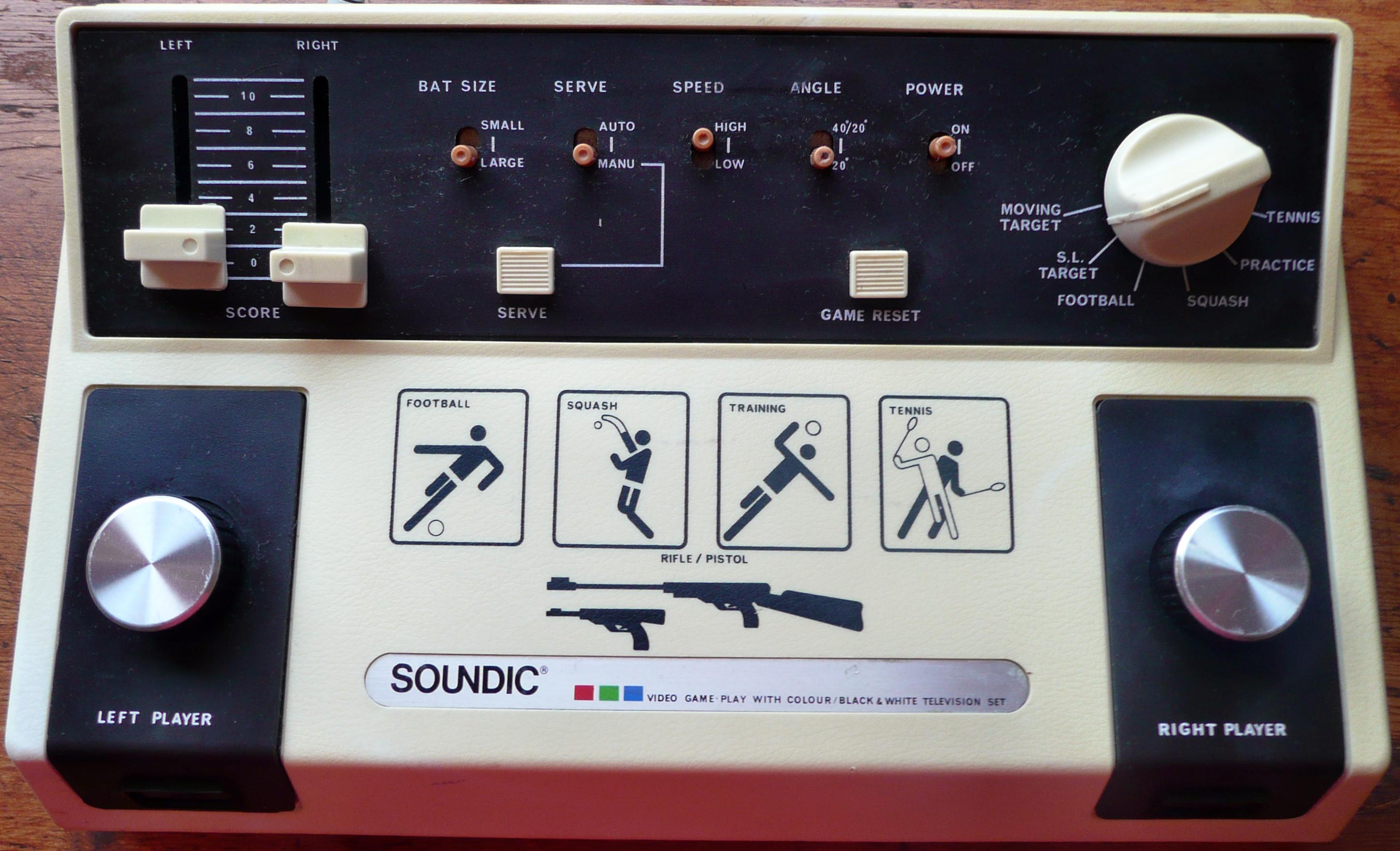 Soundic TVG SD-01 is a dedicated console that looks like the TV Scoreboard: 2&4 Player Plus Target at first glance, but uses the more common AY-3-8500 dedicated pong chip instead. Otherwise it features the same games: Hockey/Football, Two player Handball, One player Handball, Tennis and two target shooting games.