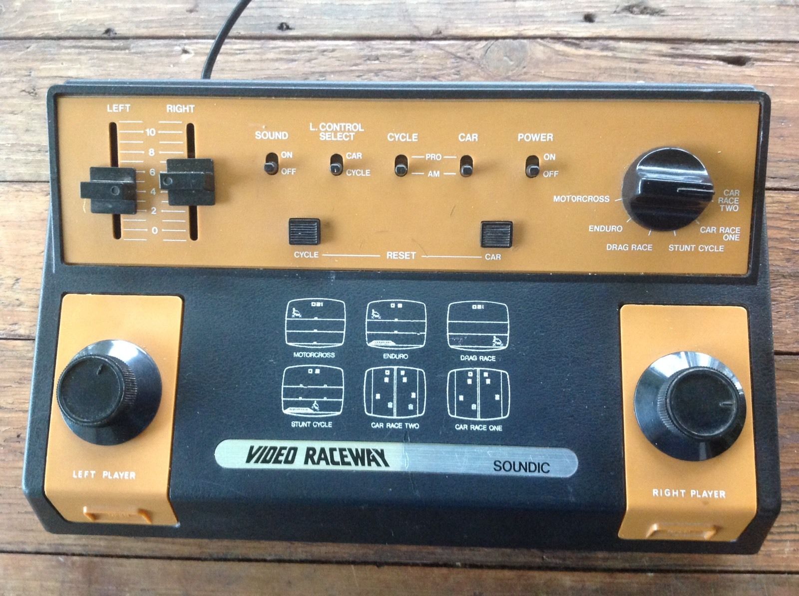 The Soundic Video Raceway is a dedicated console playing two top down racing games and four side view motocross games. The console uses the AY-3-8760 and AY-3-8603 dedicated chips. There are two different difficulty levels.