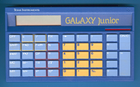 The Texas Instruments GALAXY Junior is an arithmetic calculator with 10 digits precision and algebraic logic. It has 23 functions, 42 keys and an LCD (liquid crystal) display. The power source is 2xLR44. The calculator was manufactured in Italy.