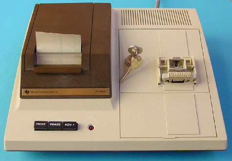 The PC-100A printing cradle followed the PC-100 within a few months. It can be used with the SR-52, SR-56, TI-58 and TI-59 (not the TI-57).Its thermal printer has 64 alphabetic, numeric and special characters which can be printed at the rate of 60 characters per second. Up to 20 characters can be printed per line on 2.5 inch wide thermal paper.