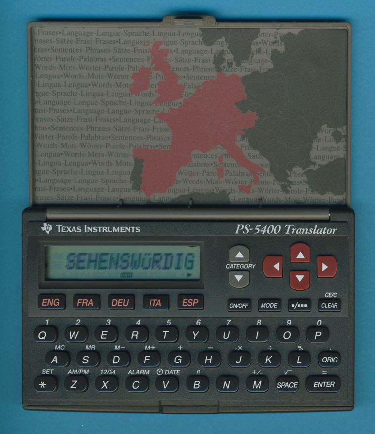 The PS-5400 Translator was introduced about two years after the first Pocket Translator PS-5600. Instead the foldable housing with a wide display line a housing similar to the early Databanks, e.g. the PS-2400 was used.