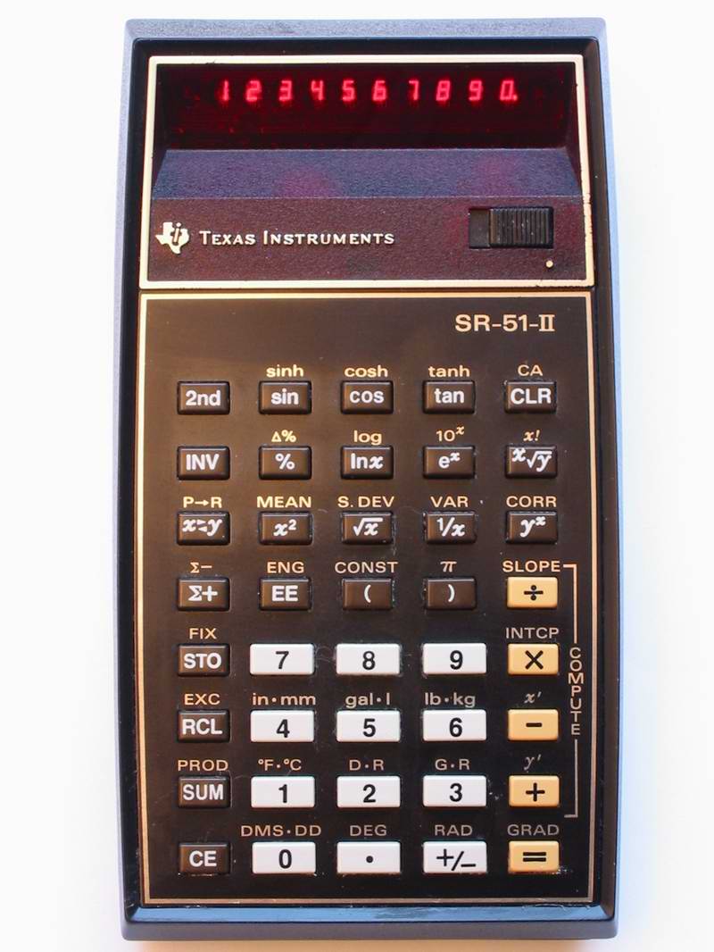 The Texas Instruments SR-51-II is a scientific calculator with 8 digits precision and algebraic logic. It has 58 functions, 40 keys and an LED (light-emitting diode) display, typical of calculators of this era. The power source is 2xAA sealed. The calculator was manufactured in Italy; USA.