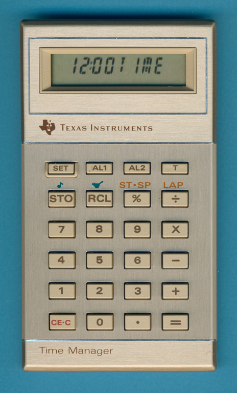 The TI-2000 Time Manager integrated in the sleek housing of the TI-1750-III a clock, two 24-hour alarms and a stopwatch with 1/10 of one second resolution.
