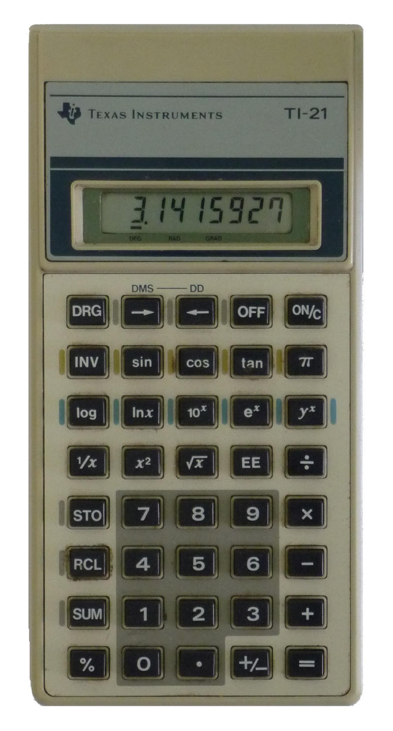 The Texas Instruments TI-21 is a scientific calculator with 8 digits precision and algebraic logic. It has 25 functions, 40 keys and an LCD (liquid crystal) display. The power source is 2xAA batteries. The calculator was manufactured in Taiwan.
