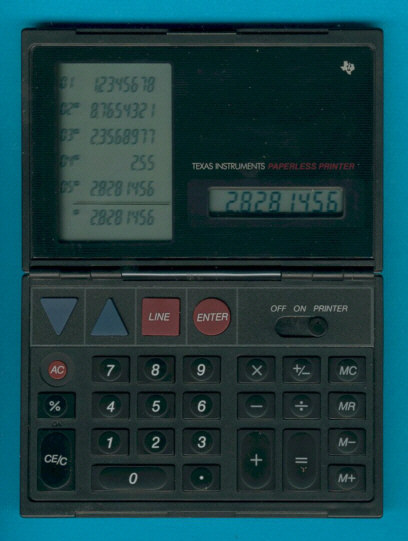 Texas Instruments introduced in 1988 a revolutionary concept: The TI-2800 Paperless Printer! The calculator works like the known printing desktops e.g. the TI-5010. All calculations are done on the main display. Instead the usual printout on a paper the results are scrolled through a secondary display with 6 lines. A maximum of 99 lines could be stored and scrolled up and down with the arrow keys.