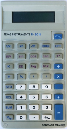 The Texas Instruments TI-30 III is a scientific calculator with 8 digits precision and algebraic logic. It has 29 functions, 40 keys and an LCD (liquid crystal) display. The power source is 2xLR44. The calculator was manufactured in Italy; Taiwan.