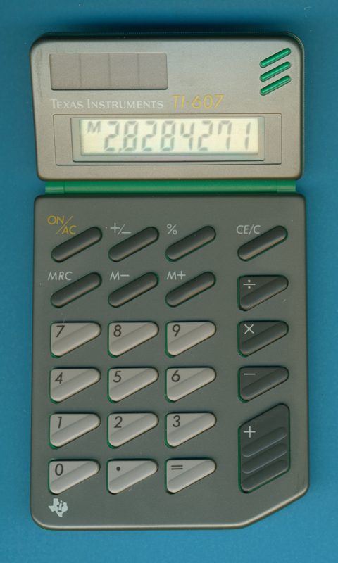 The Texas Instruments TI-607 is an arithmetic calculator with 8 digits precision and algebraic logic. It has 6 functions, 23 keys and an LCD (liquid crystal) display. The power source is Solar.